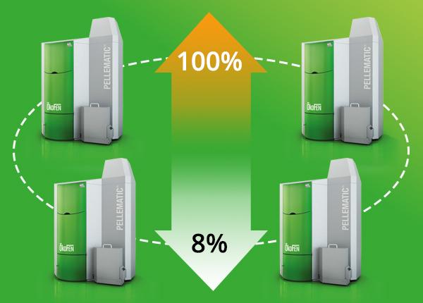 The very large modulation range of a cascade installation can meet the power requirements much better than single boiler systems. A cascade of four ÖkoFEN Pellematic Maxi boilers with condensing technology can modulate from 8% to 100%.